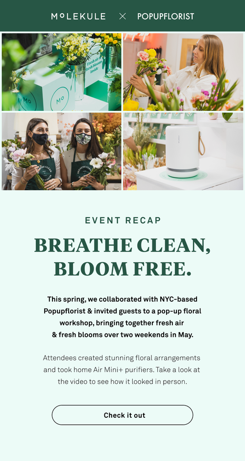 Allergy Season is peak season for air purifiers sales. This means thinking outside of the box for brand activations. Led the ideation and strategy behind Molekule partnering with renowned NYC florist and supplier to Gucci, Mac, Project Runway and more, Pop Up Florist, to generate top tier buzz around how air purification can help during peak allergy season.