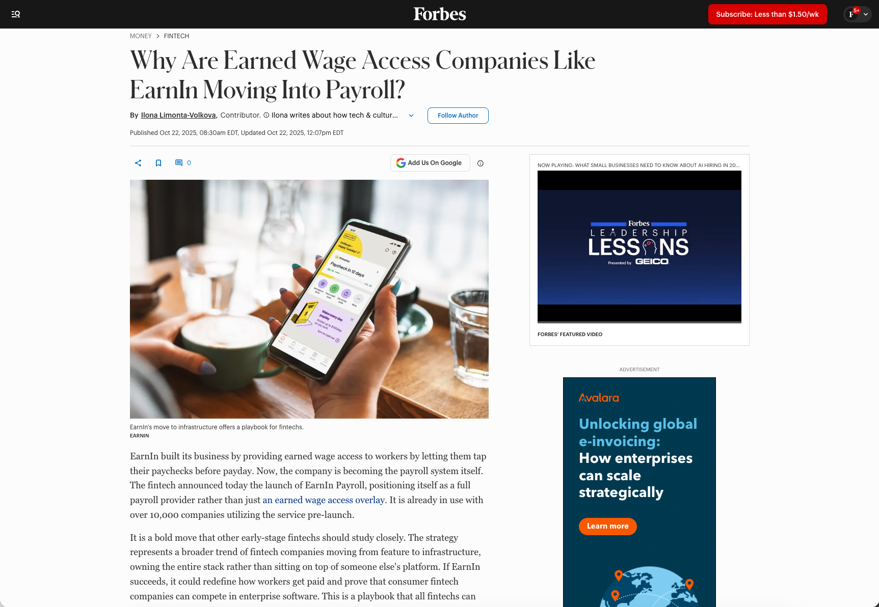 Product CommsShort writeup here EarnIn Payroll: Why Are Earned Wage Access Companies Like EarnIn Moving Into Payroll? EarnIn: EarnIn Hits One Million Live Pay Transactions As Real-Time Pay Moves From Novelty To Norm
