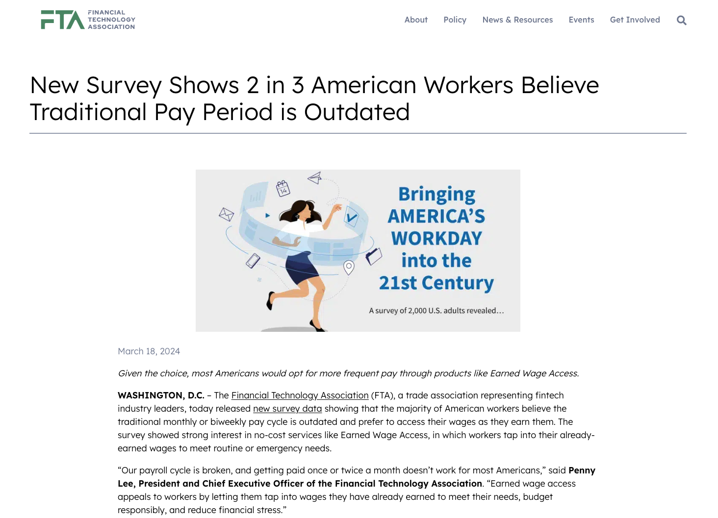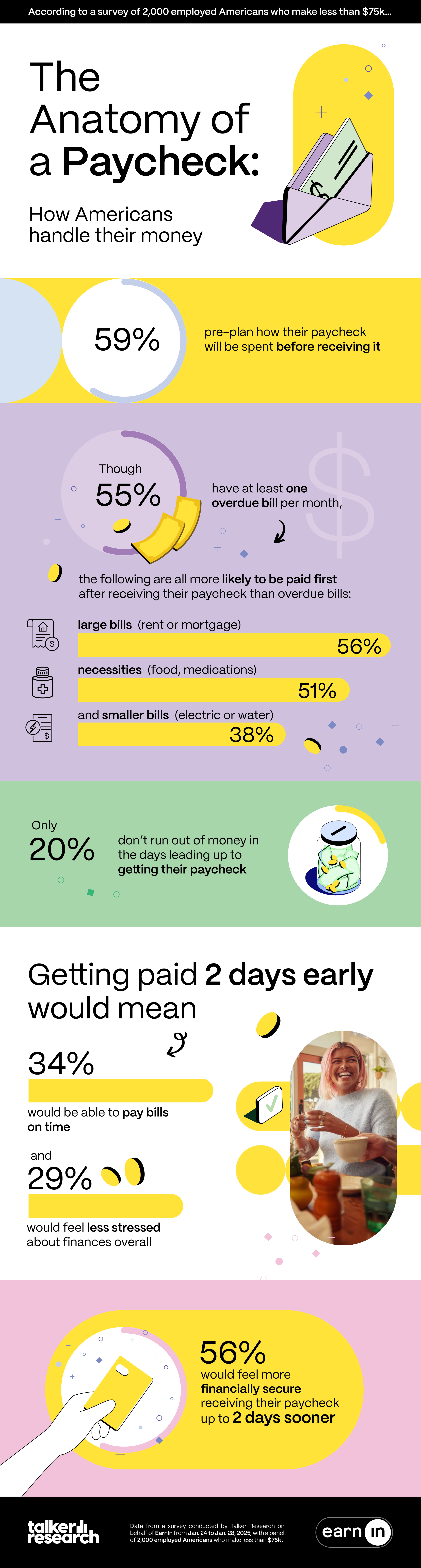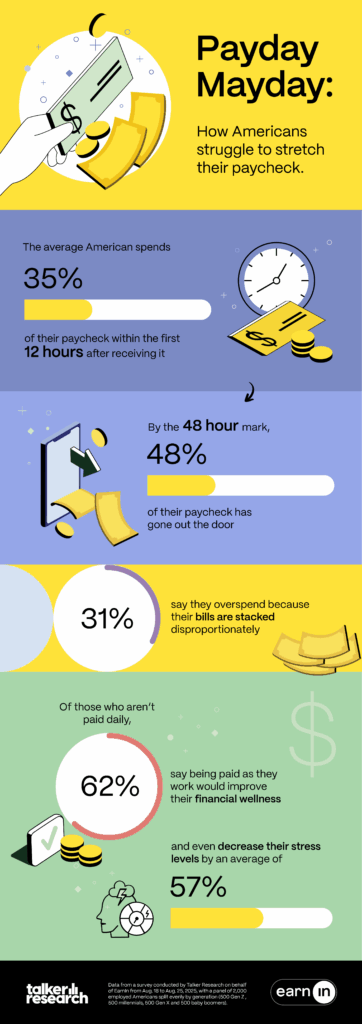 Data CommsShort writeup here EarnIn: Anatomy of the average American paycheck EarnIn: Why nearly half of your paycheck is spent after the first 48 hours EarnIn: Why New Survey Shows 2 in 3 American Workers Believe Traditional Pay Period is Outdated